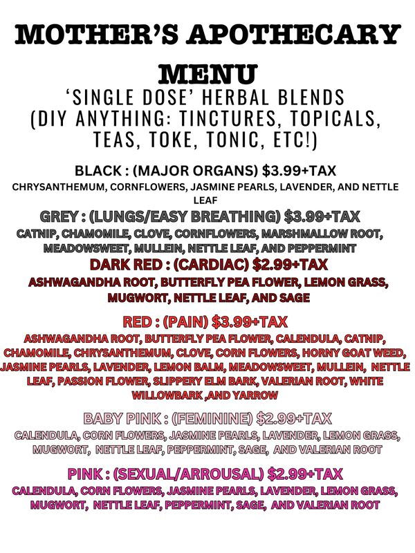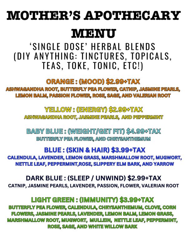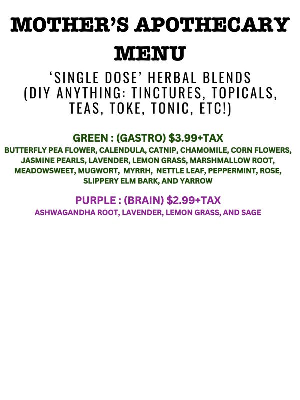 Welcome to Mother's Apothecary where Mother takes care of you!! Here you DO NOT NEED a medical card to purchase!!! Like most apothecaries we have a massive selection of loose leaf herbs, flowers, mushrooms, and roots, as well as all things natural: household products, personal products, pet supplies, botanical blends, and more!